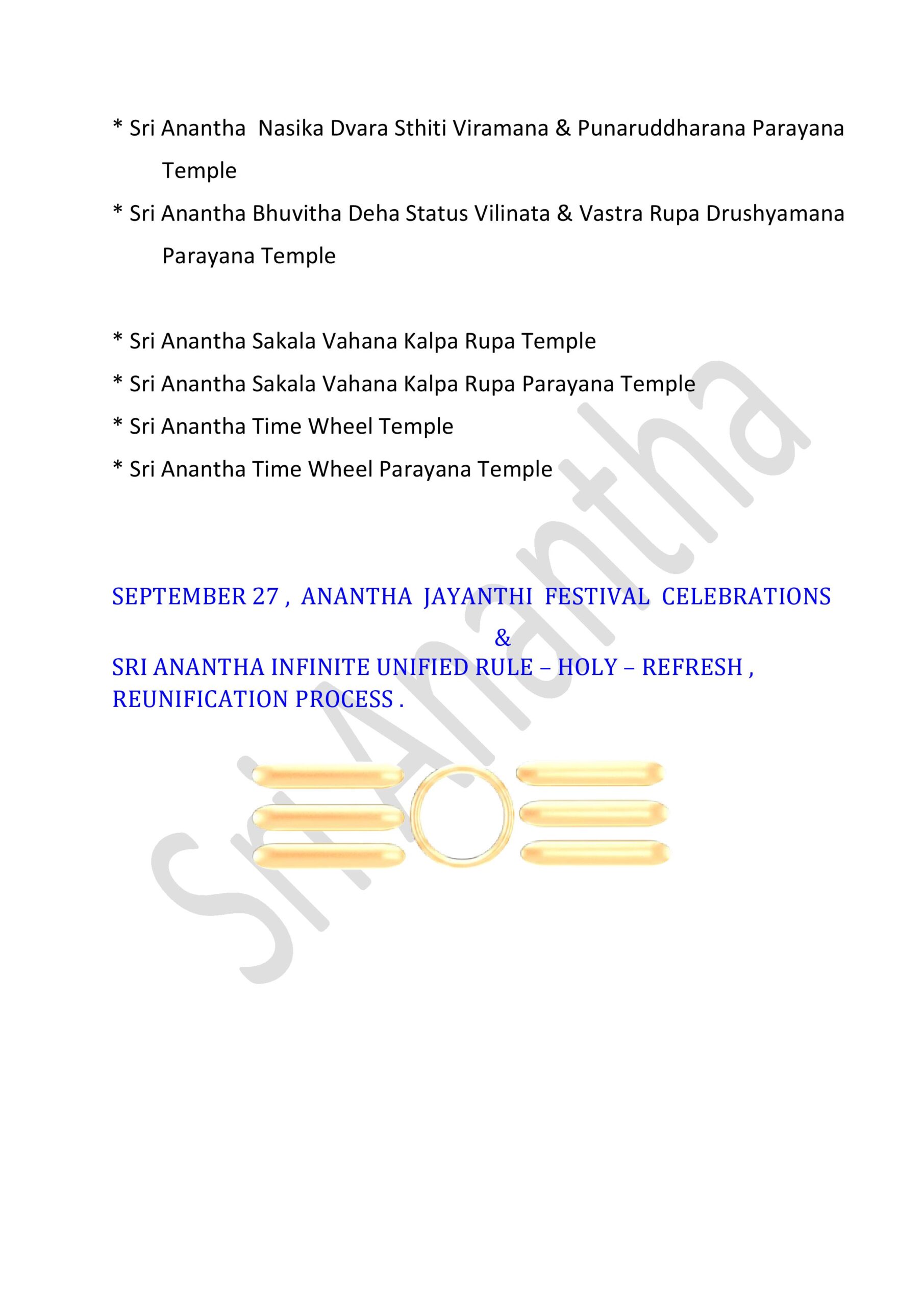 * Sri Anantha Infinite Unified Rule- Holy – Refresh , Reunification Temple