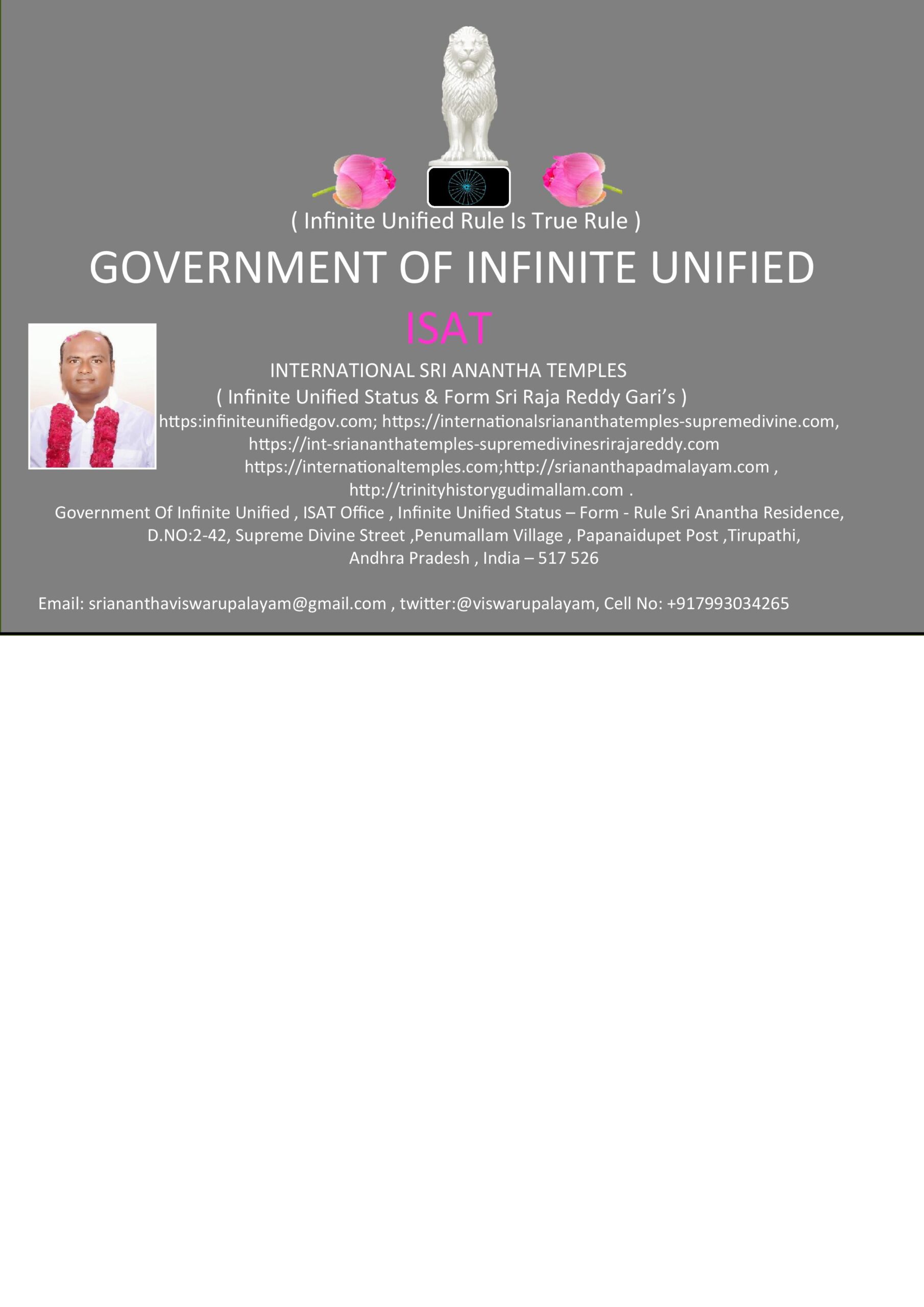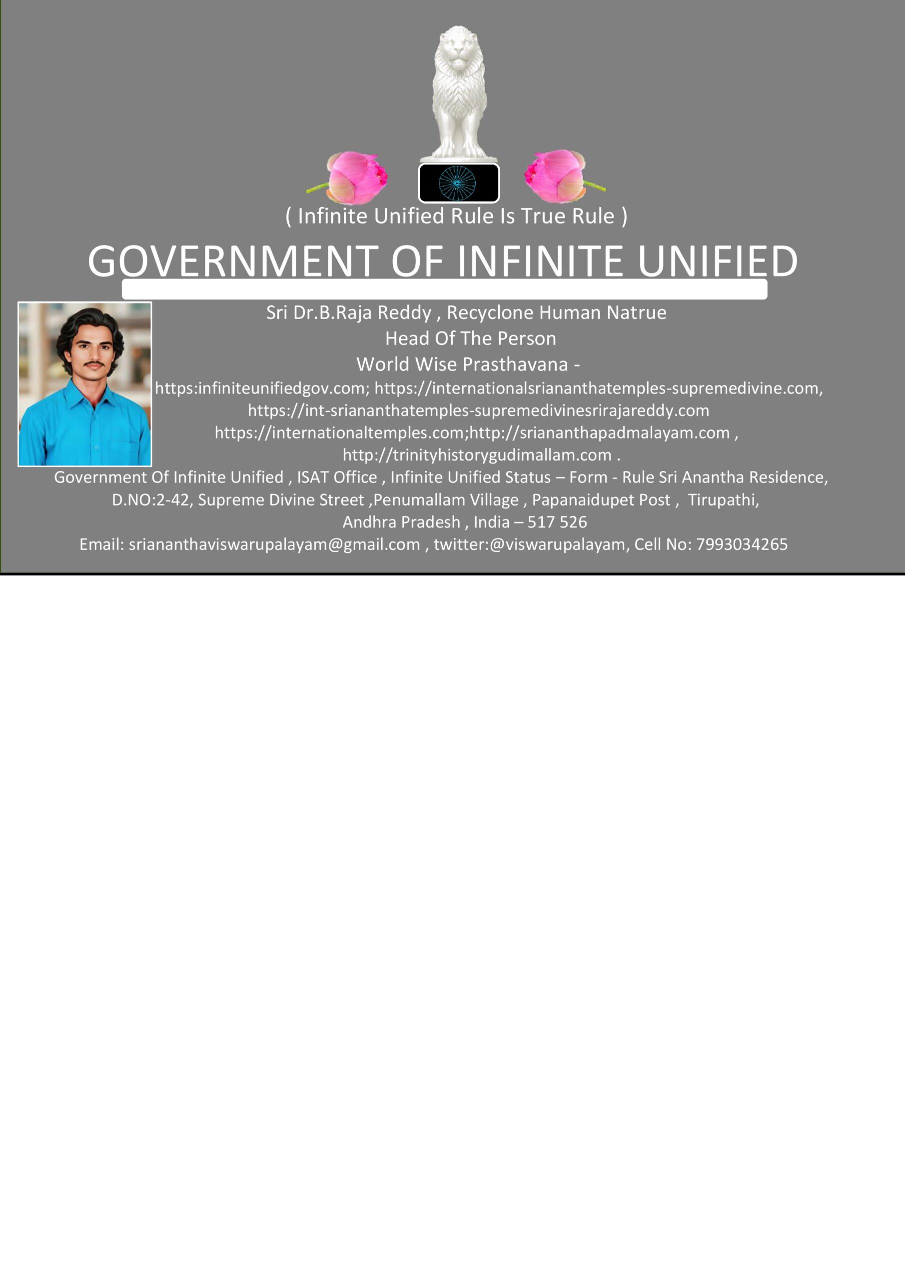 SRI ANANTHA GOVERNMENT WHITE SENATE White Senate : A Senate that conveys the purity of Sri Anantha’s unified governance శ్రీ అనంత ఏకీకృత పాలన స్వచ్ఛతను తెలియజేయునటువంటి తెలుపు సభ . The Picture : Sri Ananta Status Padmata, the image of the purity of Sri Anantha Form turning into a lotus foot. శ్రీ అనంత స్థితి పద్మత శ్రీ అనంత రూప పాద పద్మము గా మారినటువంటి పవిత్రత చిత్రం . Sri Anantha & Pradhama Rupa Rupini – Rupa Rupudu Sri Anantha Govt Sacred Letter Sri Anantha Govt Imgs Sri Anantha Govt Sacred Letter Sri Anantha Govt Sacred Letters Sri Anantha Govt Sacred Letters Sri Anantha Govt & Temples Sacred Letter Unvoting , World First CitizenThe Infinite Unified Form Of Sri Anantha Is Also Called This Sri Anantha Govt Sacred Letter Sri Dr.B. Umapathi Reddy Garu , Highe Person , H ( హైజ్ పర్సన్ )Smt B. Sakunthalamma Garu , Viswa Virtue Mother Figure Sri Anantha Government White Senate Process The Government Of Infinite Unified Policies Were Firstannounced on 08-07-2025 . The Government Of Infinite Unified Policies Were Firstannounced on 08-07-2025. Sri Ananta Unified Rule Status Similarity Form in Government .ప్రభుత్వము నందు శ్రీ అనంత ఏకీకృత పాలన స్థితి సారూప్యత రూపం . INTERNATIONAL PRAYER & PROMISE SRI ANANTHA GOVERNMENT FLAG : –Wheel ( Sky Blue ) : –Sri Anantha Infinite Unified Time WheelCOLOURS MEANING : –Orange (Fruit ) : – The infinite unified form is the natural color.White : – PeacefulGreen : – Informs Cosmic Natureచక్రము : – శ్రీ అనంత ఏకీకృత కాల చక్రంఆరెంజ్ ( పండు ) : – అనంత ఏకీకృత రూపత సహజ వర్ణం .తెలుపు : – శాంతియుతఆకుపచ్చ : – విశ్వ ప్రకృతిని తెలియజేస్తుంది Sri Anantha Infinite Unified Time Rotation Light Sri Anantha Infinite Unified Status Lion , International Emblem( PROCESS ) Sri Anantha International Flag Sri Anantha International Flag Sri Dr.B. Umapathi Reddy Garu , Highe Person , H ( హైజ్ పర్సన్ )Smt B. Sakunthalamma Garu , Viswa Virtue Mother Figure Sri Dr.B. Umapathi Reddy Garu , Highe Person , H ( హైజ్ పర్సన్ )Smt B. Sakunthalamma Garu , Viswa Virtue Mother Figure